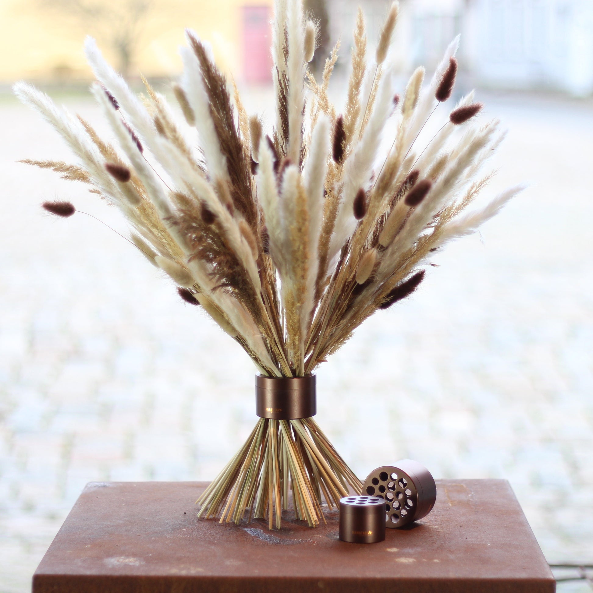 The Hanataba set includes two pieces: a large Hanataba that holds 19 stems and a smaller Hanataba for 7 stems. Delivered in a sleek matte black paper box – perfect for gifting. Made from recyclable aluminum, Hanataba is water-resistant and will not rust. Handwashing is recommended.